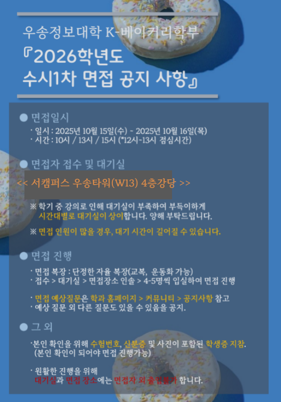 커뮤니티 공지사항 포토갤러리 학부소식 Home커뮤니티공지사항 공지사항 ※2026학년도 수시1차 면접 안내사항※ 카테고리 : | 작성자 : 학과관리자 | 작성일 : 2025.09.22 | 조회수 : 114 ☎ K-베이커리학부 학과사무실 : 042) 629-6833 첨부파일 면접사항 안내 최종.png 목록 이전글 특별재난지역 선포에 따른 예비군훈련 면제 지침 안내문 다음글 2025년 대전청년내일재단 하반기 인재육성 장학생 선발 안내